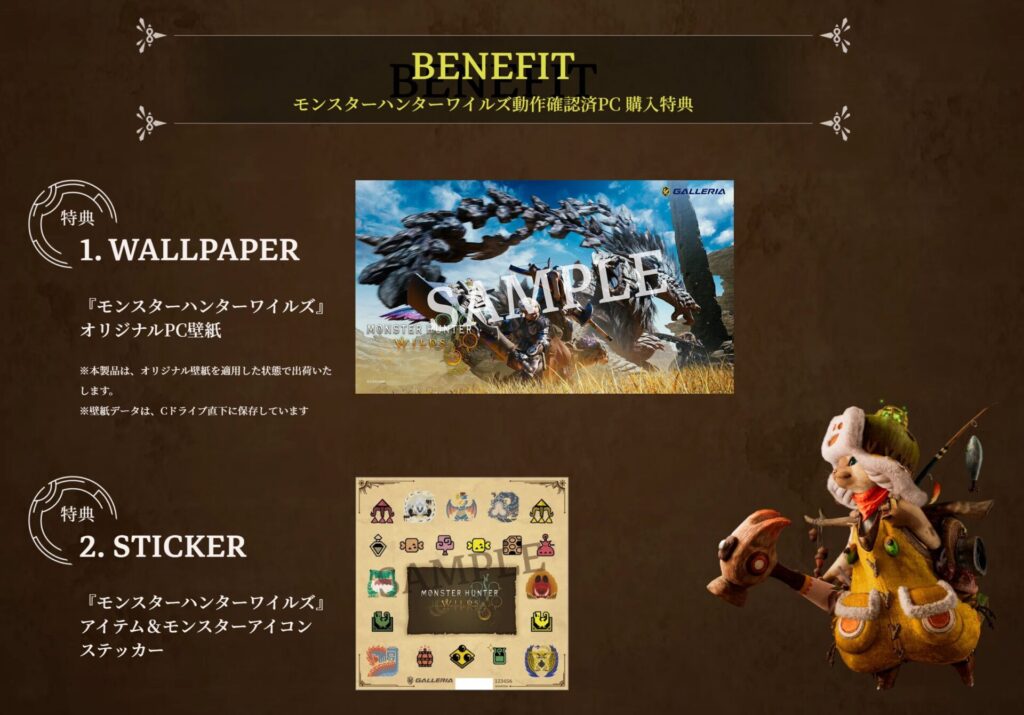 購入特典として、モンスターハンターオリジナルPC壁紙、ステッカーが付属します。