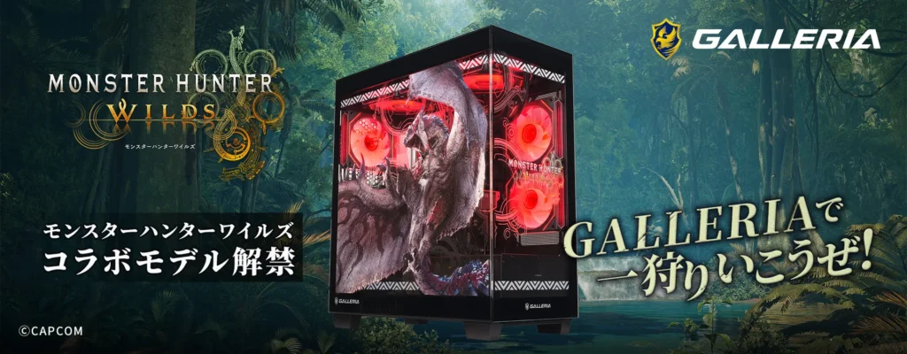 GALLERIAより新発売の「モンスターハンターワイルズ」コラボモデルは、サイドパネルにプリントされた大迫力のリオレウスが目を引く特別仕様のパソコンです。