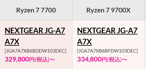 また、BTOでもRyzen 7 7700搭載モデルとRyzen 7 9700X搭載モデルで価格差はほとんどありません。